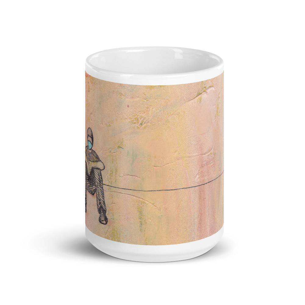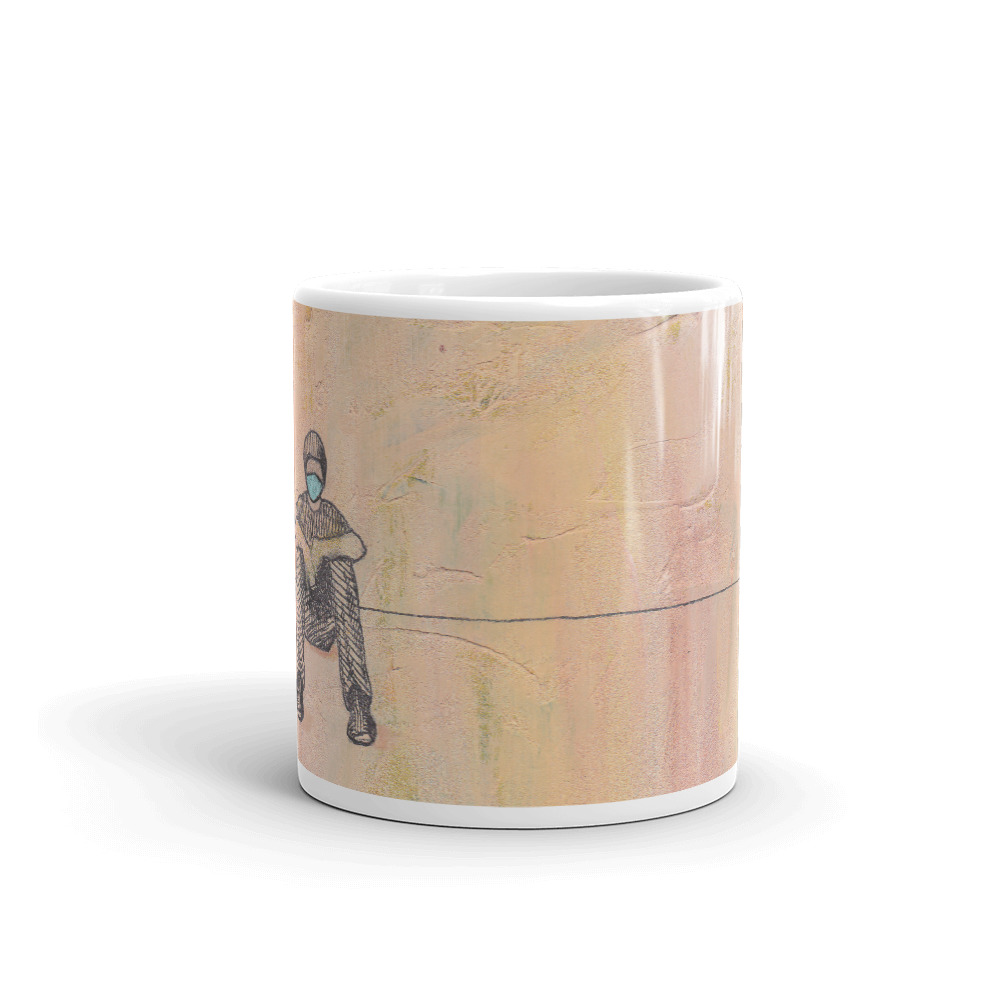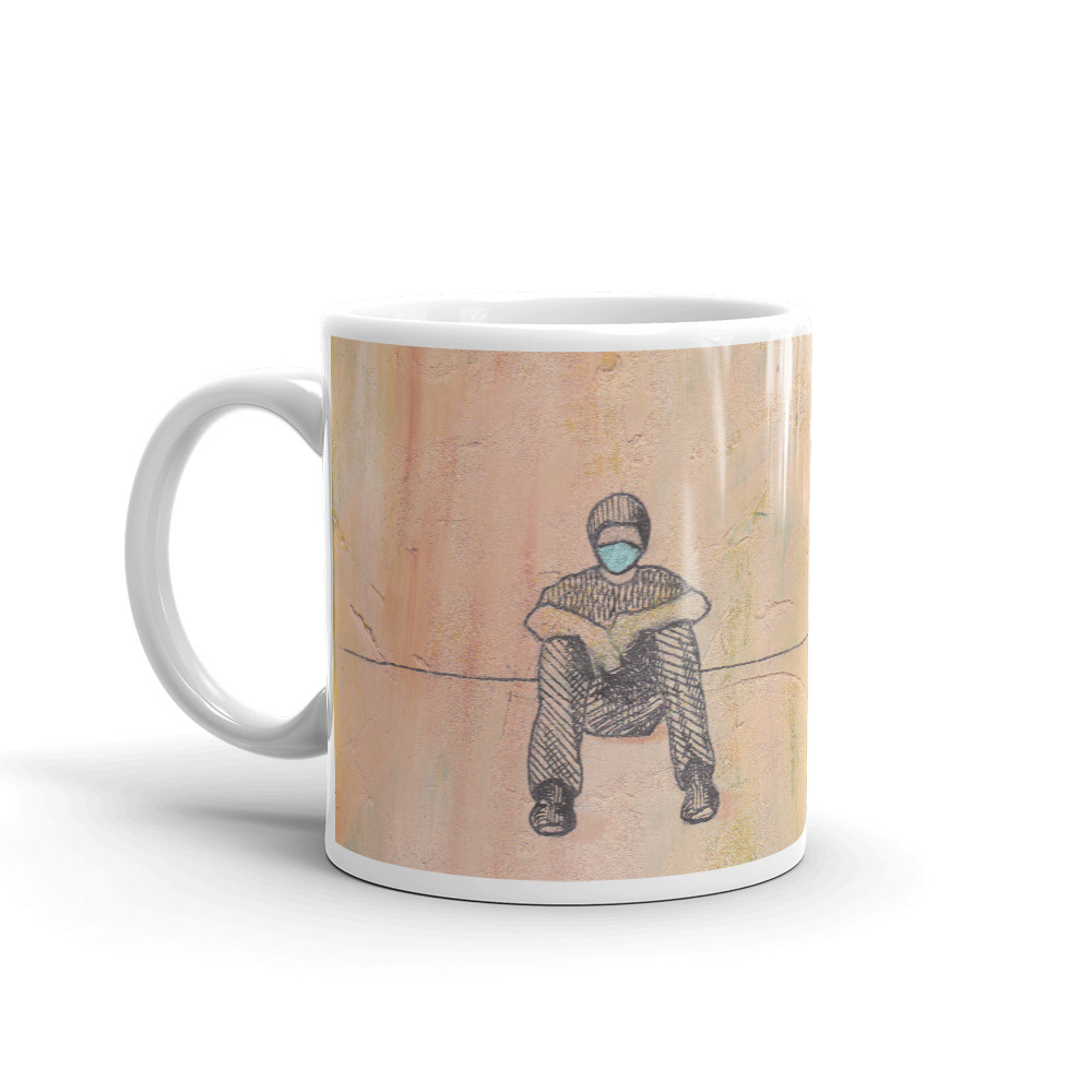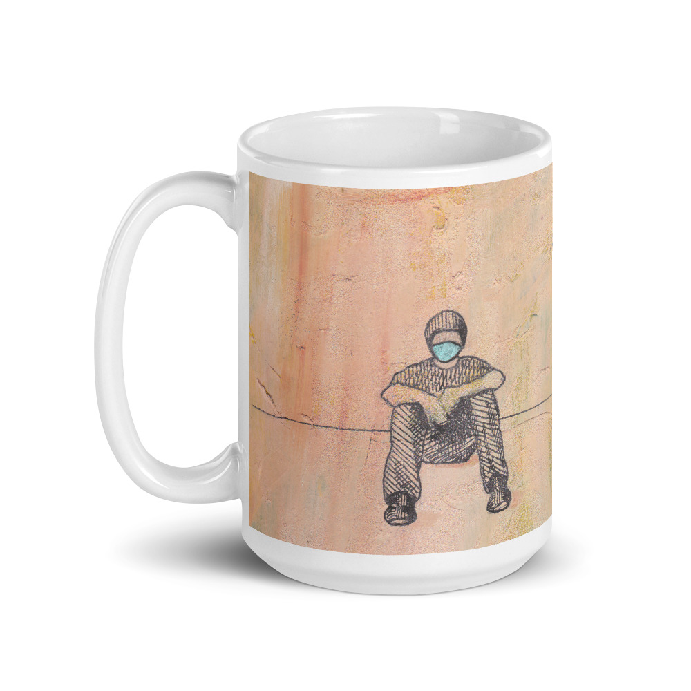 These mugs feature wrap-around art taken from an original acrylic painting. A figure sits alone wearing a light blue face mask against a textured background of light browns, creams and terracotta.• Ceramic